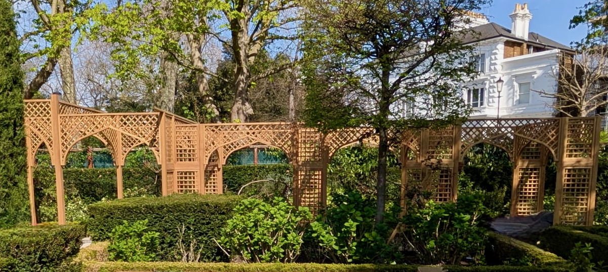 Bespoke Pergola with Square Trellis Panels (68mm gap) in Iroko