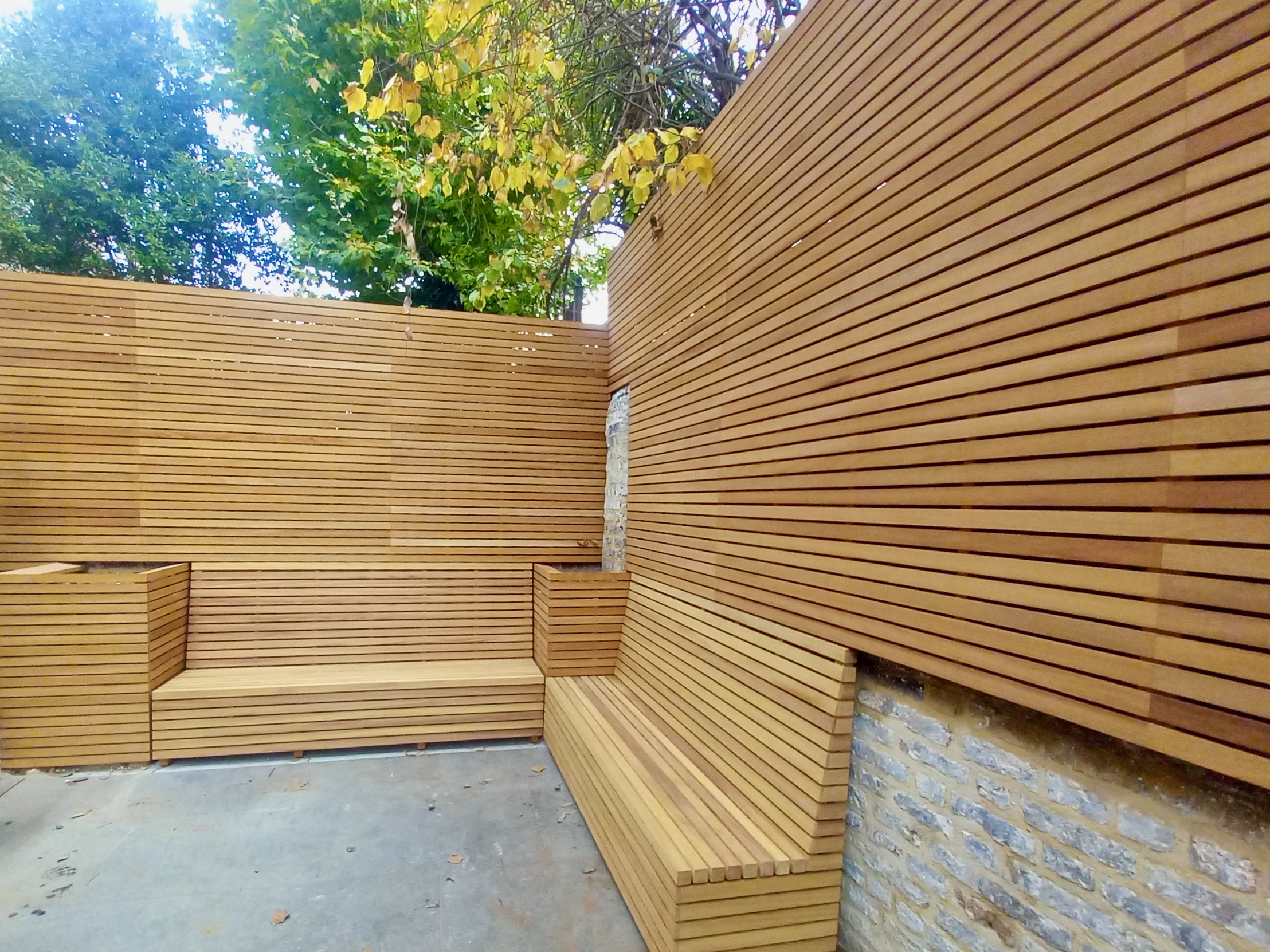 Bespoke slatted panels, planters and benches in Iroko (45mm slat, 10mm gap)