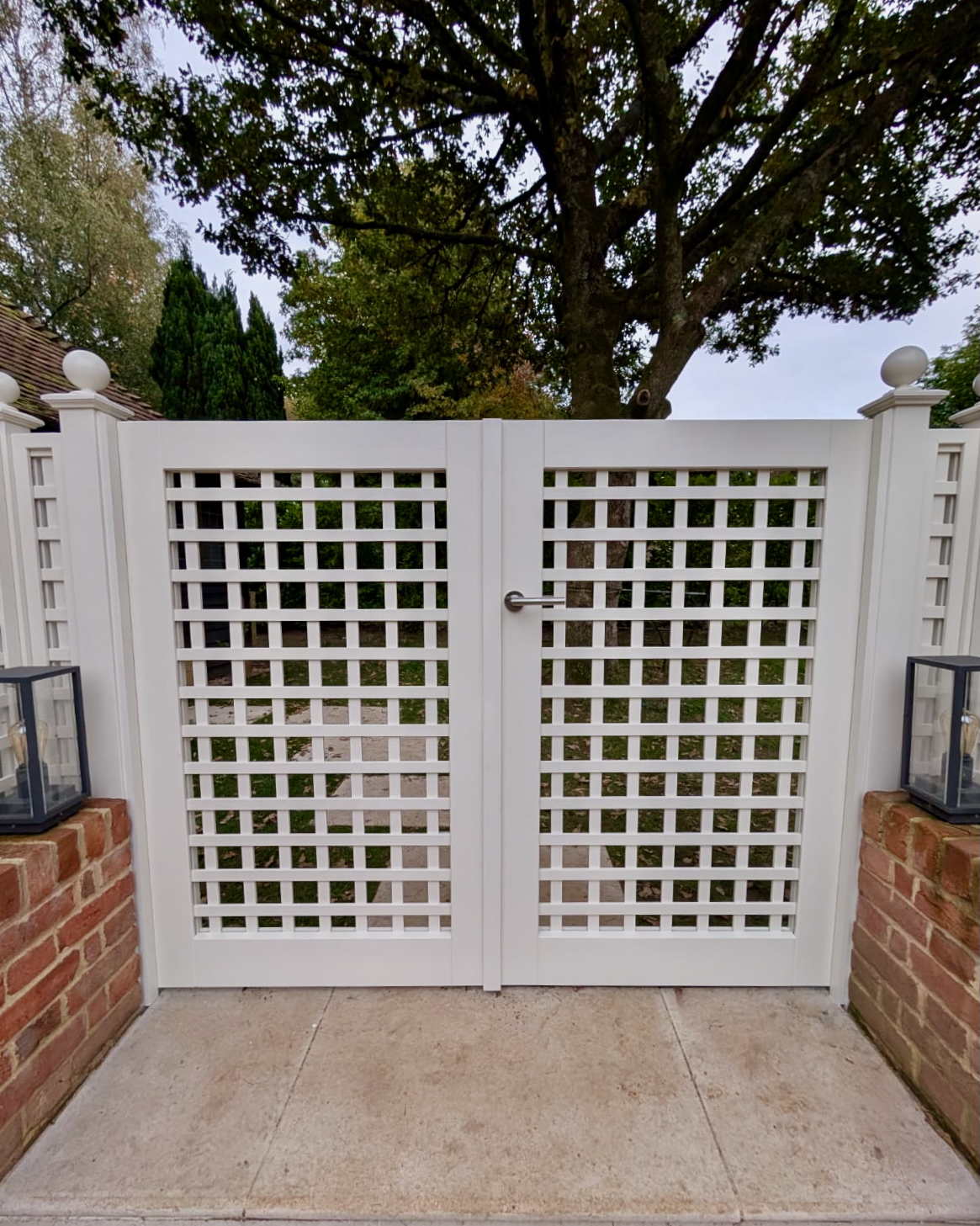 Bespoke square trellis gates, 68mm gap, painted in Orford Cream
